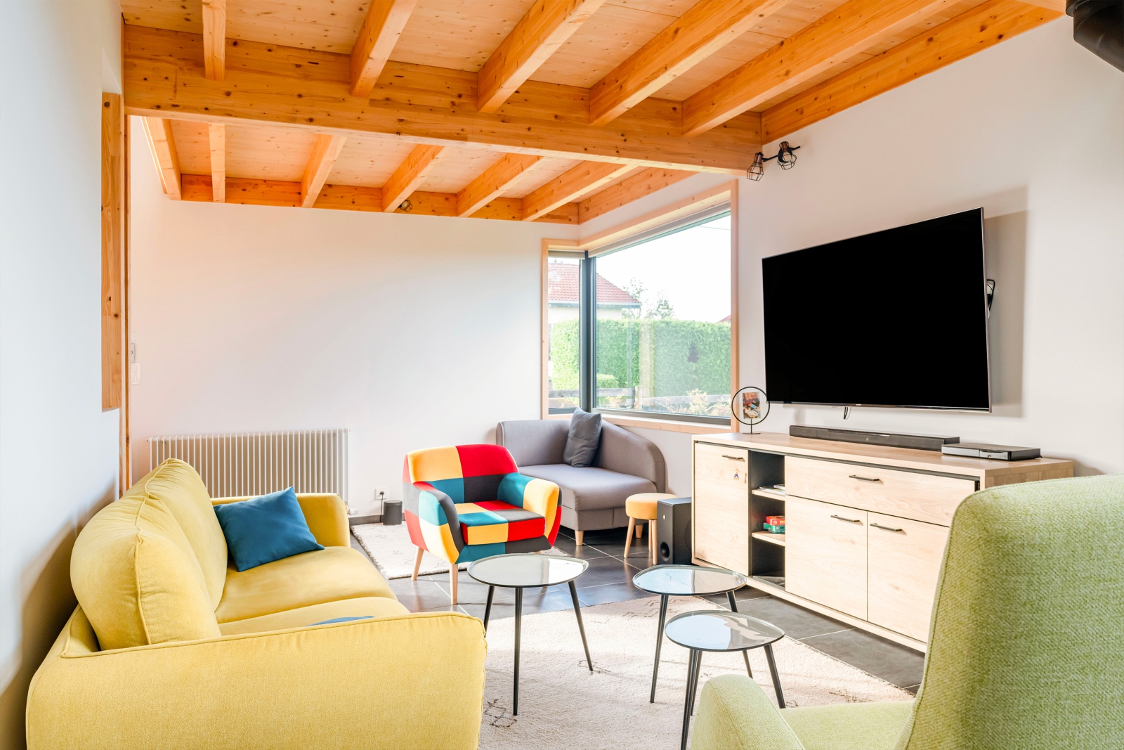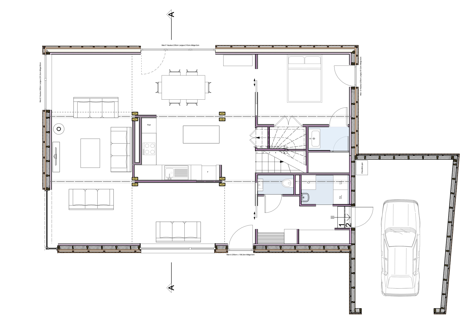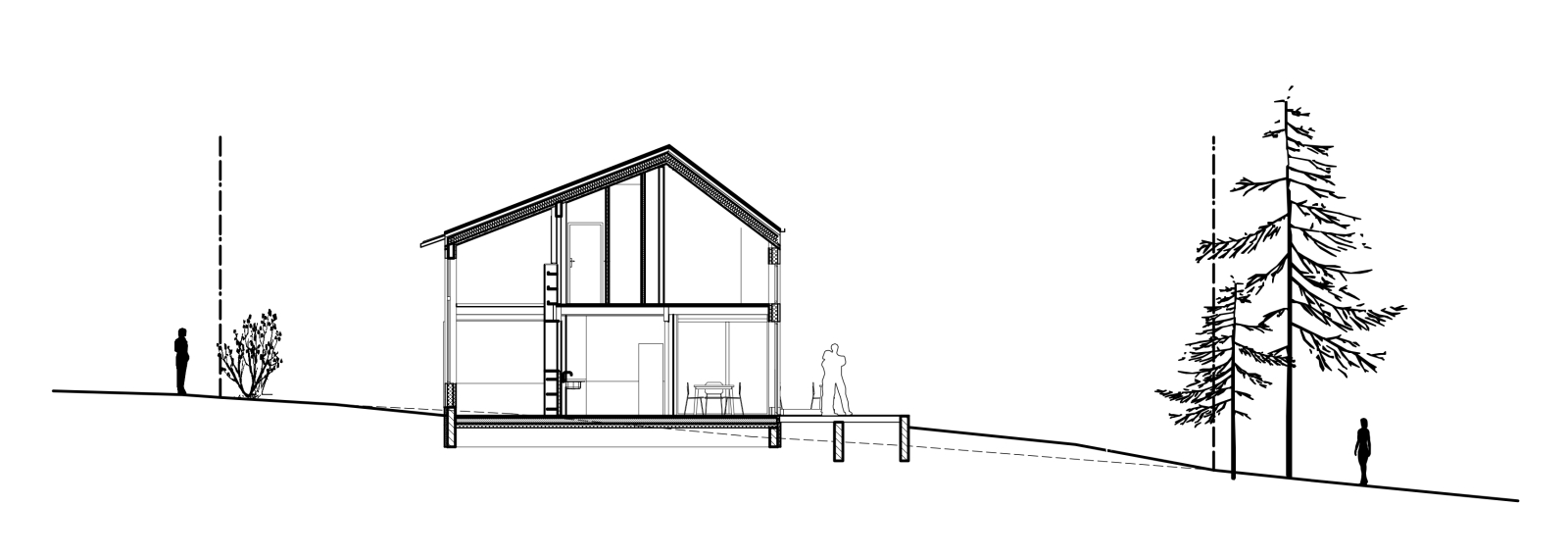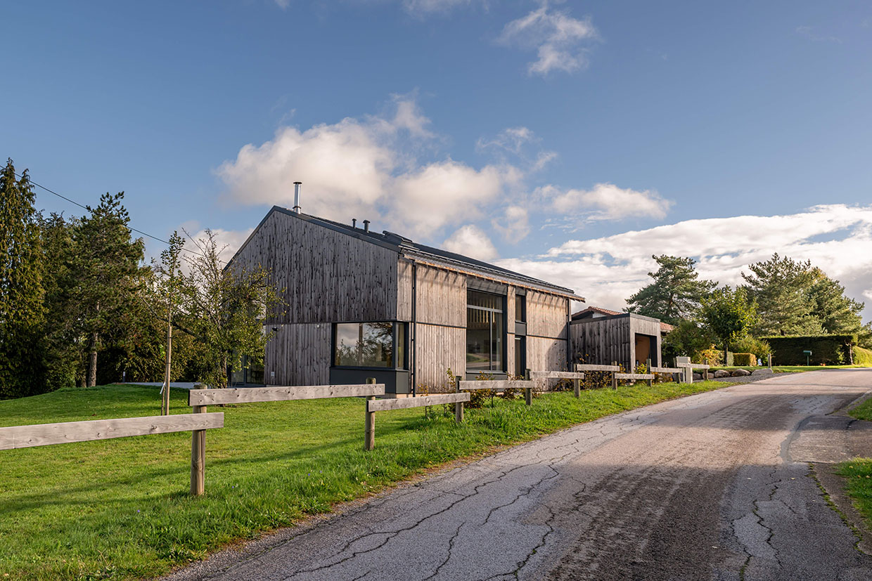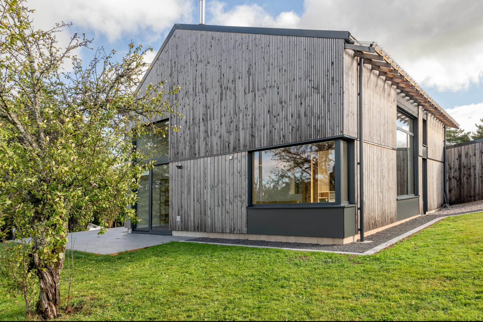 Spécificités : Maison à ossature bois, bardage douglas naturel non traité